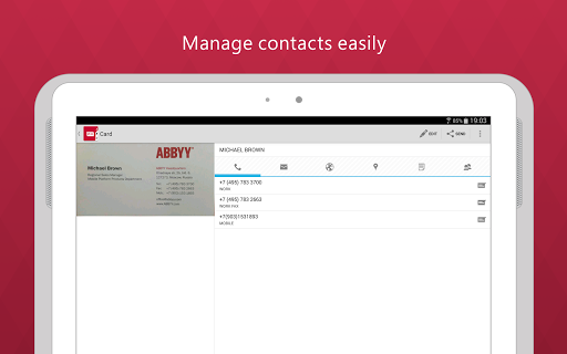 - Sync cards data across Android and iOS (iPhone, iPad) via ABBYY’s cloud storage