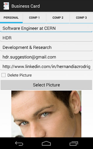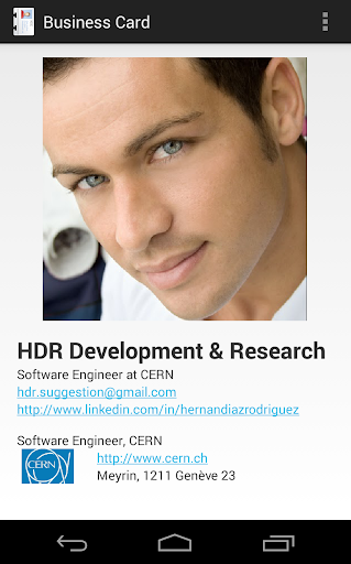 Business Card is a digital business card that you can carry on your portable device. The main idea is to replace your traditional business card in the simplest possible way. You won't have to deal again with the problems of paper business cards: What if you run out of cards? What happens if you change jobs? What if you have several jobs? Will you have to order new cards and notify all your contacts? All these problems are solved with digital Business Card.