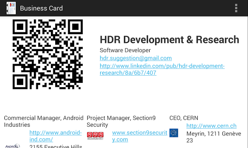 - You can show your professional data on the screen of your device (vertical and horizontal format), as if it was a traditional paper Business Card, or export it as a png file in your main storage device.