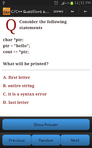 This android app includes multiple choice questions (MCQ) with their answers for computer exams. This app mainly focuses programming and its basic questions on C/C++ language.
