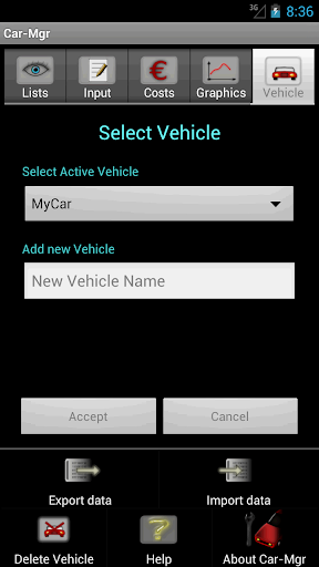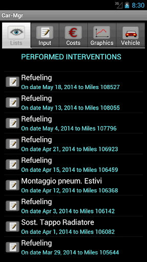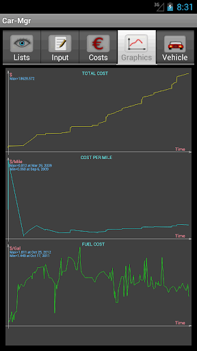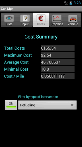 Based on the data stored Car-Mgr will perform cost analysis both in numerical and graphical form and may predict the date and mileage for the next intervention.