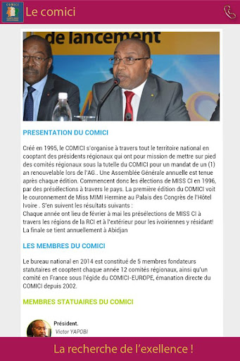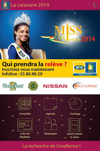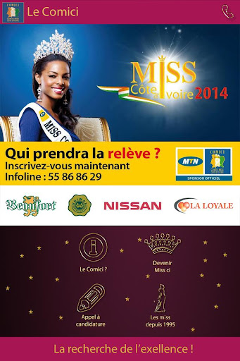 Pour cette 18ème édition de Miss Côte d’ivoire, le COMICI, a décidé de se rapprocher davantage du public à travers une application spécialement dédiée à ce concours. Cette application mobile permet de connaître d avantage Le COMICI, de découvrir les miss qui se sont succédées depuis 1996 jusqu'à aujourd’hui, et de suivre la caravane 2014 de bout en bout.A savoir, l'agenda, l'actualité, les à côté, la liste des finalistes..etc. Tous à vos téléphones! et surtout tenez-vous prêt pour participer massivement au sondage sur la miss de votre choix qui débutera dès la fin des présélections.