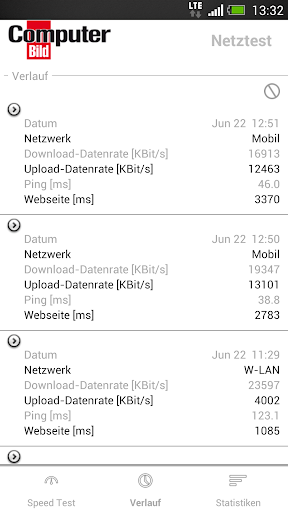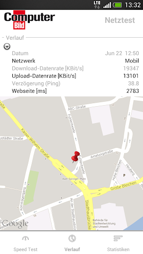 Ermitteln Sie Geschwindigkeit Ihres Netzes beim Laden (Download) und Senden (Upload) von Daten. Zusätzlich dazu werden die Reaktionszeit bei der Kontaktaufnahme zu Internetservern (Ping) und die Performance beim Laden und Darstellen von Webseiten gemessen. Alle Ergebnisse werden auf einer Tachoanzeige anschaulich dargestellt. Bereits vorgenommene Messungen können Sie über den Menüpunkt "Verlauf" jederzeit aufrufen, inklusive Angaben zum Ort der Messung.
