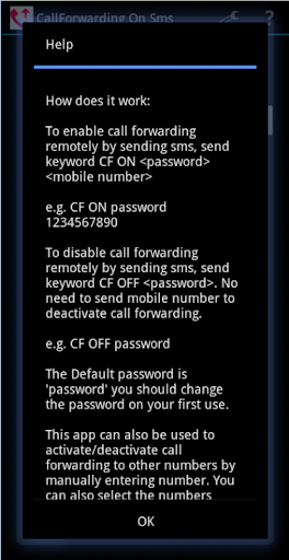 This app can also be used to activate/deactivate call forwarding to other numbers by manually entering number. You can also select the numbers from your phone book. We have given the option for forwarding unconditionally unanswered or if busy in auto setting mode.