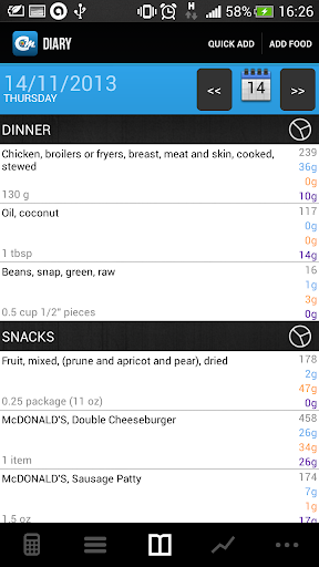 - Quickly add calories and macronutrient values to your food diary when you can't find the food you've eaten! You can edit/delete these entries later, give them names, and save them as custom foods!
