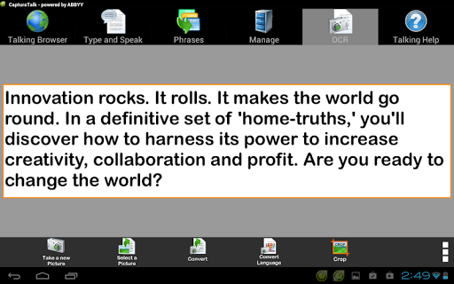 OCR: Converts text captured in a photo into editable text (We recommend a 5 mp camera with auto-focus for the best quality OCR conversions).