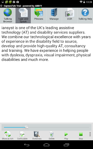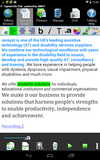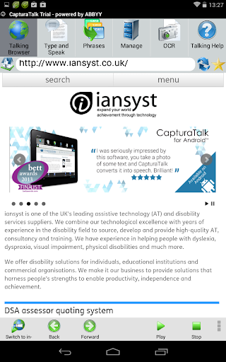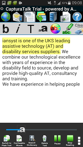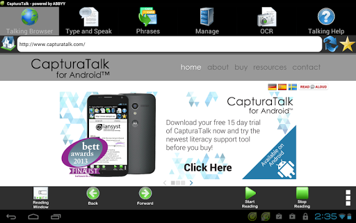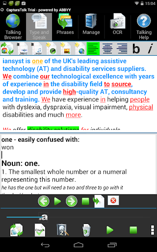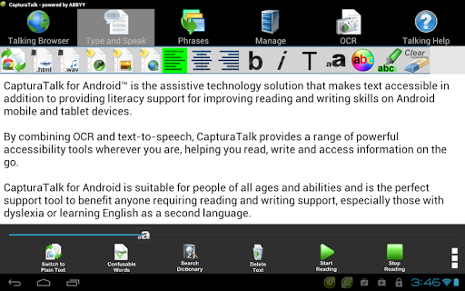 CapturaTalk is a powerful reading comprehension tool that enables users to access and understand any text (online, digital, material) at any time. It uses a variety of tools to achieve this, such the accessibility focused web browser and word processor, and a suite of pedagogic resources. CapturaTalk is useful for anyone who needs help with reading, especially those who have dyslexia or who are learning English as a second-language.