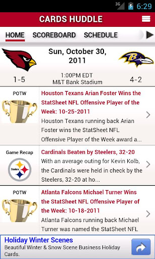 © 2011 StatSheet, Inc. All rights reserved Cards Huddle is part of the StatSheet Network and is not affiliated with or endorsed by the Arizona Cardinals or the National Football League. Certain scores and statistics copyright © 2011 by The Sports Network. Any commercial use or distribution without the express written consent of The Sports Network is strictly prohibited.