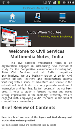 Civil Services Notes Media Player is an Android App developed to allow subscribers of www.civilservicesaudionotes.com to access secure content from their purchased micro sd cards containing training material for their civil services exam preparations.
