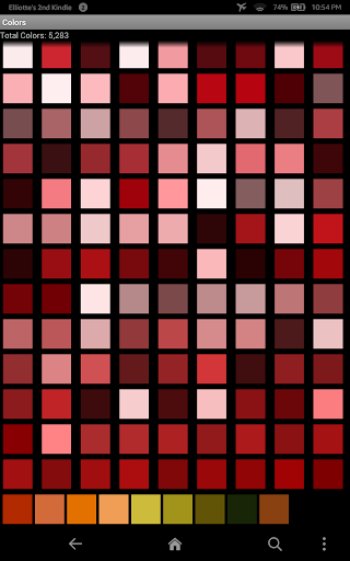 The second way to isolate colors is to use the Colors button to break down the image into its component colors. A page is shown with all the distinct colors in separate tiles. These tiles can be selected to build a palette. A Right Tap (right click with mouse or hold and release on a touch screen) on a color in the palette will jump to the nearest color match in the list of all colors so you can see similar hues.