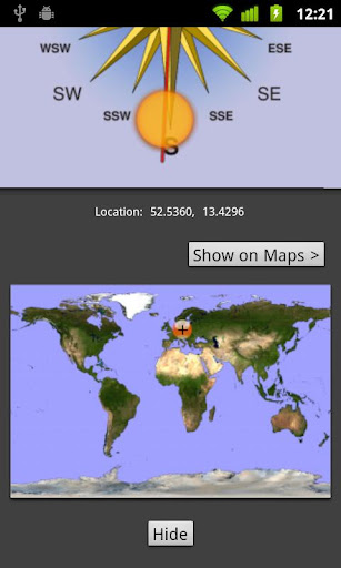 This application adds a compass to your device. It either uses the built in magnetic compass (if available) or provides a sun compass (You just have to see the sun and know the time to determine the north direction). Use it for all your outdoor activities whether it's hiking, biking or for a boy scout camp. The sun compass is not affected by magnetic anomalies.