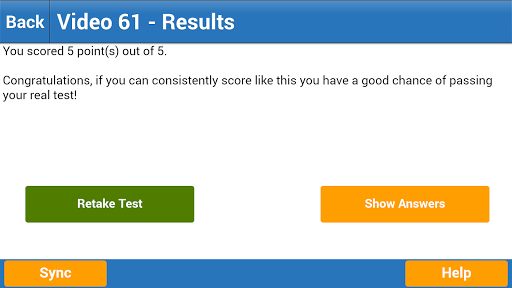 - View your progress for each video with clear, easy to understand colour indicators. When you click on each video you'll see your last score and the date and time you took the test.