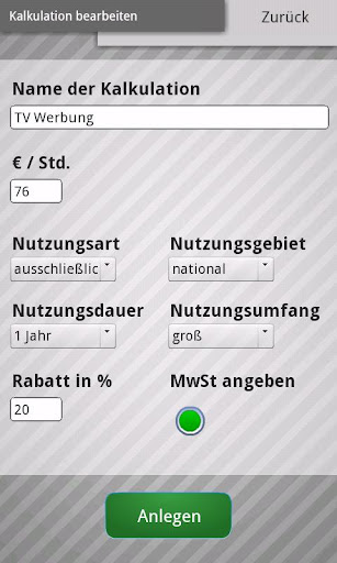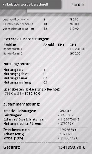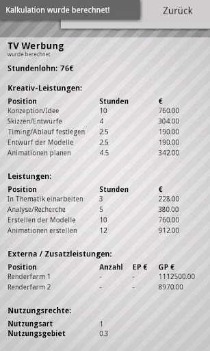 Gone are the days where you had to work out a calculation from scratch after items / rights / etc. has changed. Edit only the data of the calculation or their items and press "Start Calculation". In less than 5 seconds, the data got recalculated.