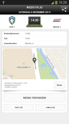 • Upload en bekijk foto's en/of video's tijdens of na de wedstrijd