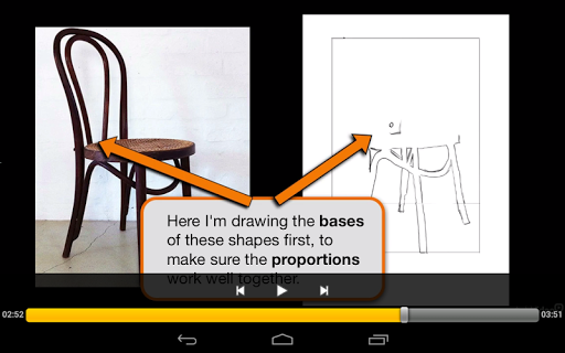 After a brief section introducing the concepts and tools, Siobhan dives right into the techniques you need to know to accurately draw complex shapes. This is where you learn to "see" shapes and the space around them. Watch as Siobhan draws a chair – by drawing only the space around the chair – all the while explaining the important concept of recognizing negative space!