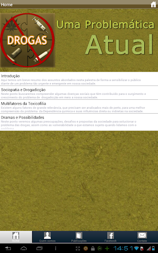Esta App trás a palestra com temática principal "Drogas: Um problema Atual", que é subdividida nos seguintes assuntos:
