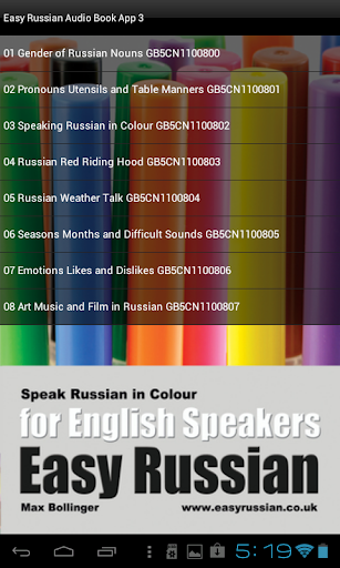 This Russian language audio training course includes elements of Russian grammar, vocabulary and cultural content complete with dialogues and texts recorded by native Russian speakers together with English guide in every module. Each lesson focuses on specific theme and in this volume we cover colours, emotions, likes, dislikes, seasons, weather, art, music. Grammar and phonetics include difficult Russian sounds, gender of Russian nouns, use of pronouns, adjectives and introduction into Russian case system. Cultural content includes short poems, listening to Russian weather forecast, use of weather talk as conversation filler, reading popular fairy tales in original, basic table manners, and social etiquette. More detail here: http://www.interactive.eu.com/easy_russian_3_speak_russian_in_colour.html