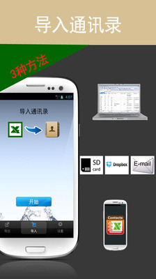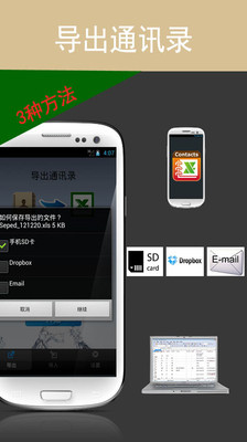 2. Excel<->联系人将你手机中所有联系人信息连同照片打包到一个ZIP文件中,并通过Email、SD卡、Dropbox、Box或新浪微盘等方式导出到你的电脑中。