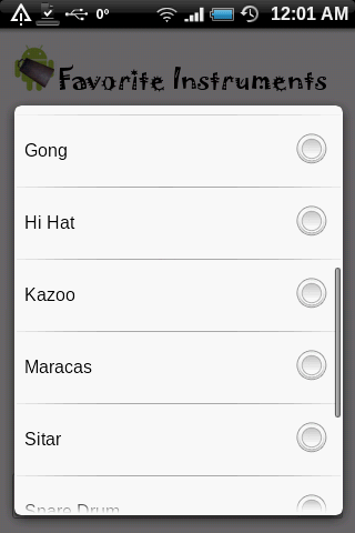 Bell, bike horn, cowbell, triangle, bass, snare, cymbal, gong, washboard, tambourine ...