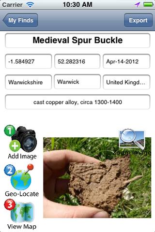 In 3 easy steps you can photograph your find, record its coordinates and add a description each find is automatically date stamped. Later you can review and amend the details. Each record is auto-saved and there's no upper limit to the number of finds you can store. Finds can be exported via file share or email.