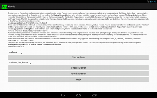 The purpose of Fixwdc is to make representation across America better. Fixwdc allows you to make and view requests made to any representative in the United States. Every representative can monitor requests made to their district. If you click on the Make a Request button, after selecting a district, you will be able to enter and send your request. The Favorite button will then remember this district so that you can quickly return to the Request page for that district. Requests may be up to 500 characters. If you have more to write, you can make multiple requests, part 1, part 2, etc. The 500 character limit helps to make the requests searchable. Anyone, including representatives, can see requests for any district on the web. For example, requests made to Oklahoma_4th_district can be viewed at: