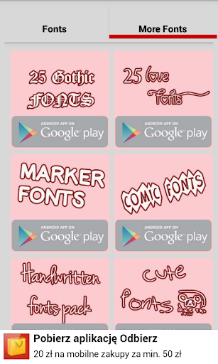 這是包標記主題的字體,對於三星的設備,您可以使用上您預設的系統字體。1.打開應用程式,選擇字體,按一下字體設置按鈕 2。如果不工作在您的手機,請轉到設置 > 顯示設定 > 3 的字體設置。如果你還沒有此功能表,您的手機則不支援此應用程式僅適用于三星設備和 HTC 感 6 + 所有 rom 與排字成像公司 FlipFont ® 程式相容。免責聲明: 此應用程式不是贊助、 核可和附屬與排字成像公司擁有者 FlipFont 商標/版權和技術。此應用程式不包含任何受版權保護的檔和原始程式碼。字體包是獨立字體畫廊什麼可以使用 FlipFont ® 程式中,但工作 100%需要三星、 HTC 感 6 或與其他 ROM 使用 FlipFon ® 程式並接受由排字成像技術股份有限公司