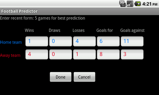 Football Predictor helps predict football (soccer) games by employing statistical methods on data entered by the user. League data, form data and previous meetings data are entered for the home and away team, then the Predict! button is used to predict the match outcome. It is possible to use all three, two or just one of the predictors on a given match (the user can select the combinations with the toggle buttons). Furthermore it is possible to specify that the game is played on a neutral pitch, which will not factor in any home advantage.