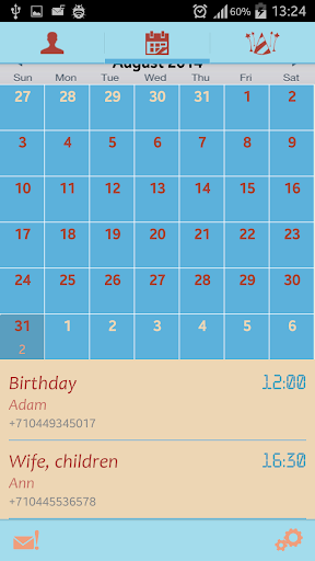 This application will allow you to create for each contact separately or for group of contacts of SMS which will be sent to time specified by you and date, it is also possible to establish additional control for the message that it went through the period specified by you after the first sending. Also in this appendix there are special events, such as: New year, Valentine's Day, on March 8, etc. (The database of holidays will gradually increase). Also you can add, change, delete the holiday or, an ordinary annual event. Also there is a convenient interface and a calendar thanks to which you will be able to know always beforehand what at you SMS, is planned for what day and time. Also you will receive reports on a condition of delivery of your messages (It is very useful when you planned SMS for a year forward and forgot about him since to you reciprocal SMS with thanks can come, and you won't understand at all in what business). In settings there is an option about shutdown of a soundtrack of reports in set time not to disturb you during a dream. Also in settings is available couple more of pleasant options.