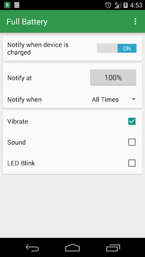 Additionally, Full Battery provides you with great flexibility, allowing you to tell the app to notify you at any battery charge you want!