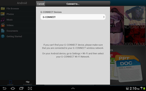 The G-CONNECT™ App for Android Tablets, let’s you easily and conveniently connect to your G-CONNECT wireless storage device. All content is automatically discovered and organized into Photos, Videos, Music and Documents categories. Wirelessly enjoy your favorite content on your Android Tablet. It’s easy, convenient and great for on the go!