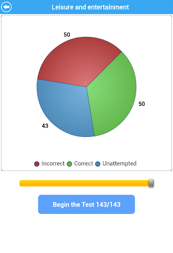 You can test yourself on vocab with intelligently designed quiz system. All words are categorized in topics. The practice module allows you to reattempt incorrectly answered questions or questions that you haven't addressed yet. At the end of each test you can see the scores and review your answers. The pie chart shows your current progress.