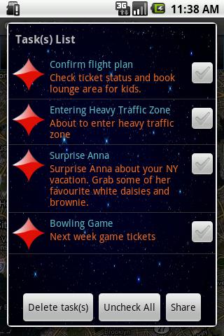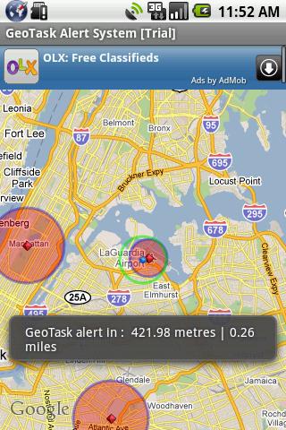GeoTask Alert System is a GPS based task alert system works using GPRS/3G/Wi-Fi Networks. The application allows the user to specify alerts or tasks on Google map along with the range in 1-100 miles or km. Once the GeoTask Alert service is started, current Gps location point is matched to set of tasks on the map. If any task list is available in current location, the user is alerted along with the distance in meters from the specified task. Use your imagination to set up task reminders or alerts and be reminded automatically when you reach specified area or range.