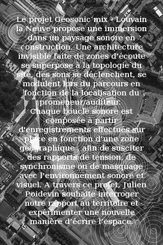 Le projet Géosonic mix - Louvain la Neuve propose une immersion dans un paysage sonore en construction. Une architecture invisible faite de zones d’écoute se superpose à la topologie du site, des sons se déclenchent, se modulent lors du parcours en fonction de la localisation du promeneur/auditeur.