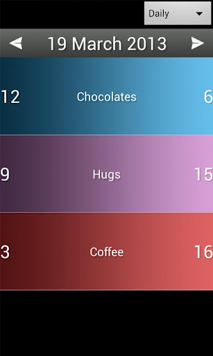 Keep count of anything you want - kisses, hugs, a pat on the back, chocolates, cupcakes and sad faces too! Swipe left to add one to your Get total and swipe right to add one to your Give total. Whatever you want to keep a count of, GiveGet will add it up for you.