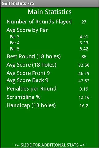 Don't have the PGA Tour following you around with ShotLink, calculating your golf stats? Want the same stats as the Pros? Golfer Stats Pro is an easy, fast scorecard entry and statistical tracker. Get many of the same stats the pros use to find their weaknesses and improve their game.
