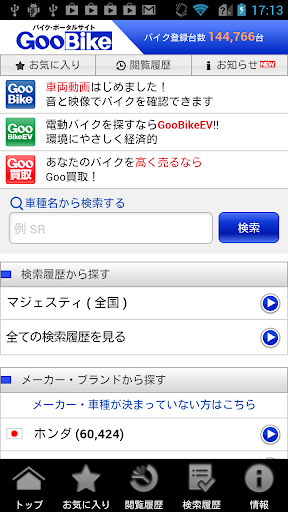 Gooバイク情報の検索アプリは、ホンダ、ヤマハ、カワサキ、スズキ、テラモーターズのような国内メーカーや