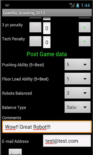 This app was created to make FIRST FRC scouting more convenient for the 2012 season. Team members track a robot during matches using their Android phone. At the end of the match they click the "Send" button to e-mail it to the person compiling the data. The data is embedded within XML style tags in the text of the e-mail. These can be parsed or copied into whatever you created to store your scouting data. (I created an Access DB for ours. I copy and paste the e-mail text into a text box and click a button to parse.) Since it's e-mail you can pick it up at your convenience from nearly any computer.