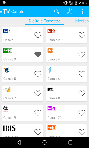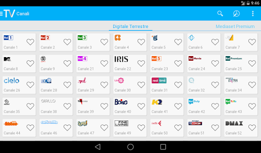 Rai Uno,Rai Due,Rai Tre,rete 4,canale 5,italia 1,La7,MTV,Deejay TV,Rai 4,iris,Rai 5,Rai Movie,Rai Premium,Cielo,TV2000,La7D,la5,Real Time,QVC,mediaset extra,italia 2,giallo,top crime,Boing,K2,Rai Gulp,Rai Yoyo,Frisbee,cartoonito,Super!,fine living,laeffe,tgcom24,dmax,Rai Storia,Focus,Rai Sport 1,Rai Sport 2,SuperTennis HD,France 24 ,Rai Scuola,Sportitalia,alice,leonardo,marcopolo,nuvolari,iLIKETV,Agon Channel