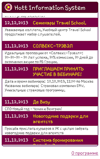 Мобильная версия внутренней новостной ленты сети «Горячие туры» Hott Information System. Свежая информация от управляющей компании, новости от туроператоров-партнеров, сообщения о продаже отказных туров в вашем мобильном устройстве. Включив push-уведомления, вы будете оперативно получать информацию о новых сообщениях в новостной ленте.