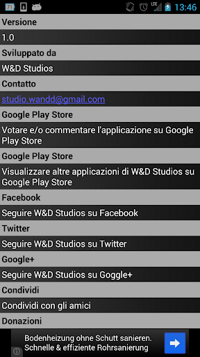 Per qualsiasi segnalazione, feedback, errori, miglioramenti, critiche non esitare a contattarci per email oppure sui social network. Siamo presenti su Facebook, Twitter e Google+, tutte le informazioni posso essere visualizzate all'interno dell'applicazione sotto "Informazioni sull'applicazione" oppure nella schermata principale nella bottom bar.