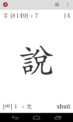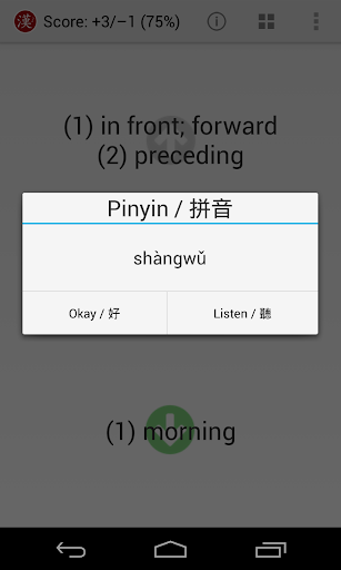 This ad-free program contains all the vocabulary for the HSK (Hanyu Shuiping Kaoshi) level 1 (242 words, comprised of 174 characters – each available in both traditional and simplified styles).