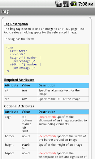 The HTML tags are categorized and searchable. Each tag information screen contains a description, standard and optional attributes, event attributes, examples, browser compatibility, valid DTD table, and version information. In addition, most of the examples include the actual rendered output.