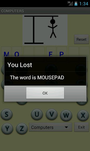 The word to guess is represented by a row of boxes, giving the number of letters. If the guessed word is correct, the word will appear in all its correct positions. If the suggested letter does not occur in the word, the application draws one element of the hangman diagram.