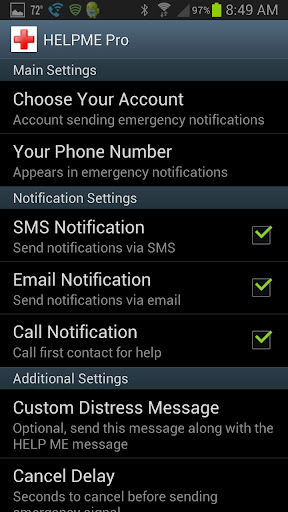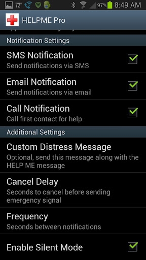 HelpMe Pro allows you to add a custom distress message and choose which type of notifications you wish to use and can even select specific methods for each contact.