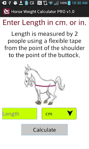 Enter heart girth and length in cm or in to calculate, store and review your horse's weight. Weight is stored by date so you can see the changes in your horse's weight over time.