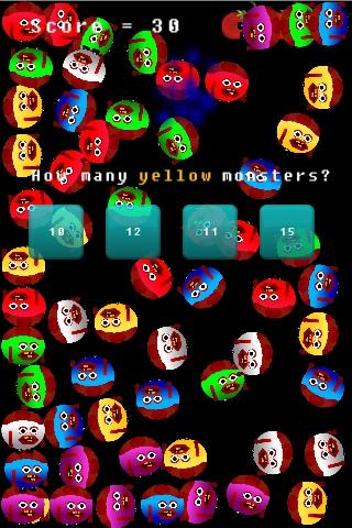 Lots of monsters are moving on the screen. You are asked to count them. But you do not count them all. You only count the monsters of a specific colour. There are four multiple choice answers. Get an answer correct to progress to the next round and gain a point. 100 points completes the game. The game starts out easy but soon becomes difficult.