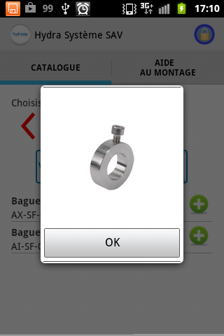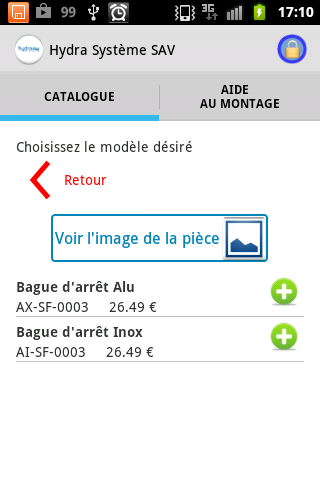 The app lets the user consult the spare parts catalog and then order parts from it. To send an order, you will need to log in the app. If you are already a Hydra Systeme's customer, you can ask your credentials to our reception.