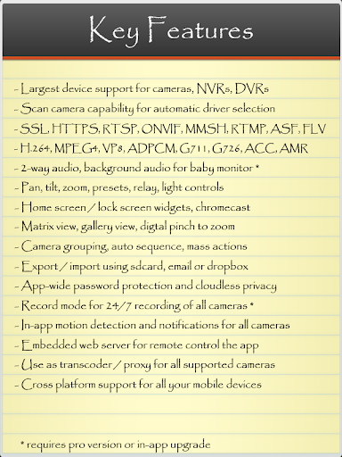 Features include matrix view, pan tilt zoom, home/lock screen widgets, grouping, encryption and in-app motion detection.