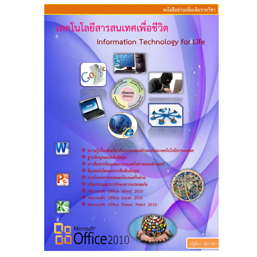 เป็นหนังสืออิเล็กทรอนิกส์(E-BOOK) เกี่ยวกับความรู้พื้นฐานเกี่ยวกับระบบคอมพิวเตอร์และเทคโนโลยีสารสนเทศ การประยุกต์เทคโนโลยีสารสนเทศโดยเน้นการจัดการเอกสาร ตารางคำนวณ การนำเสนอผลงาน การใช้คอมพิวเตอร์และการจัดการแฟ้มข้อมูล เครือข่ายคอมพิวเตอร์ การใช้อินเทอร์เน็ตเพื่อการสืบค้นข้อมูล และการเคารพสิทธิทางปัญญา จริยธรรมและความรับผิดชอบในการใช้เทคโนโลยีสารสนเทศต่อสังคมส่วนรวม