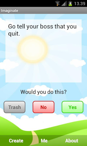 Imaginate gives you suggestions for things to do and lets you give suggestions to others. Your suggestions are instantly visible to all other users. In your top list, you can follow how many people who have seen your suggestions and if they like it or not.